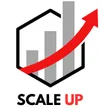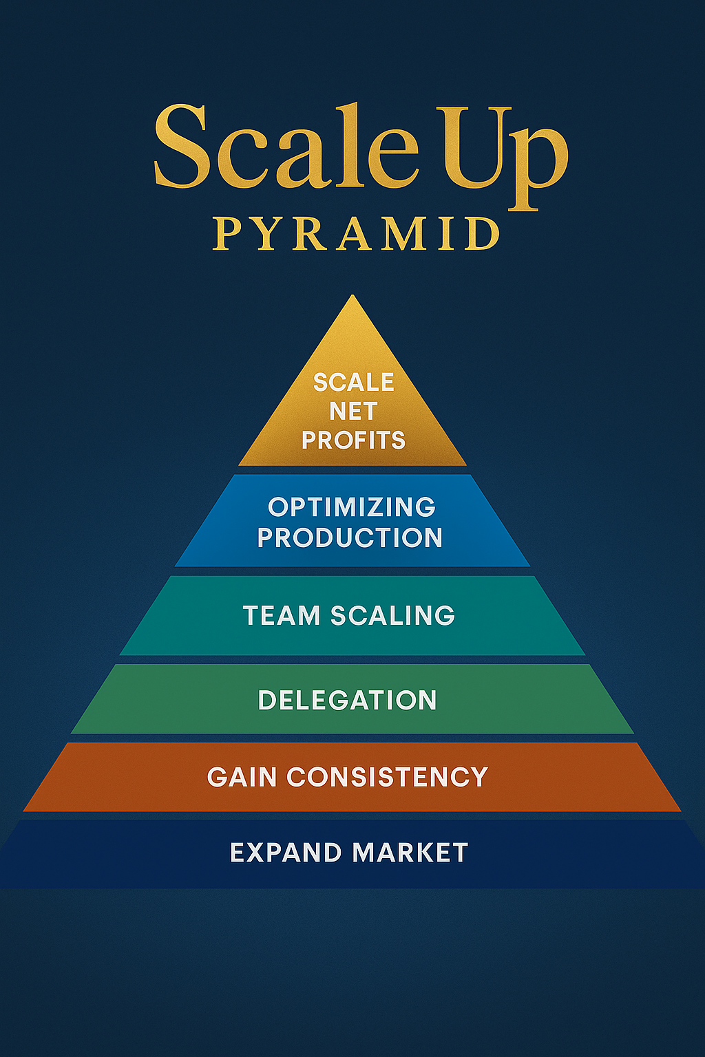 Diagram of a pyramid titled 'Scale Up Pyramid'. The pyramid has five levels, from bottom to top: 'Expand Market', 'Gain Consistency', 'Delegation', 'Team Scaling', 'Optimizing Production', and 'Scale Net Profits' at the top.