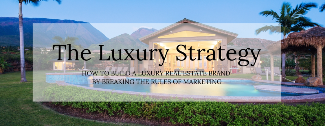 A luxurious house with a swimming pool and mountain scenery, overlaid with text about building a luxury real estate brand.